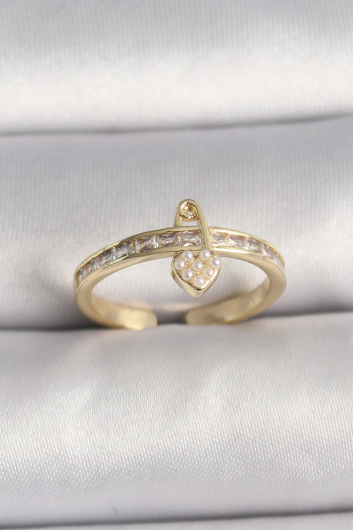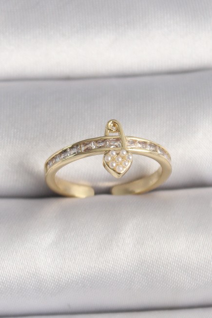 Pirinç Gold Renk Zirkon Taşlı İnci Detay Kilit Kalp Figür Ayarlanabilir Yüzük - 259954