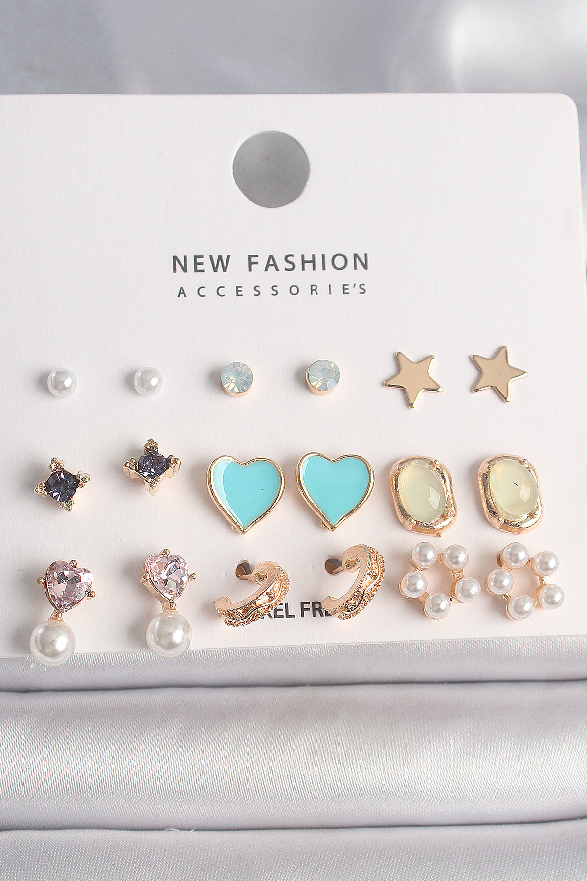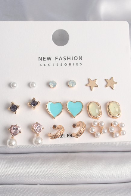 Pirinç Gold Renk Zirkon Taşlı İncili Çiçek Mavi Kalp Figür 9 Çift Kadın Küpe Seti - 260624