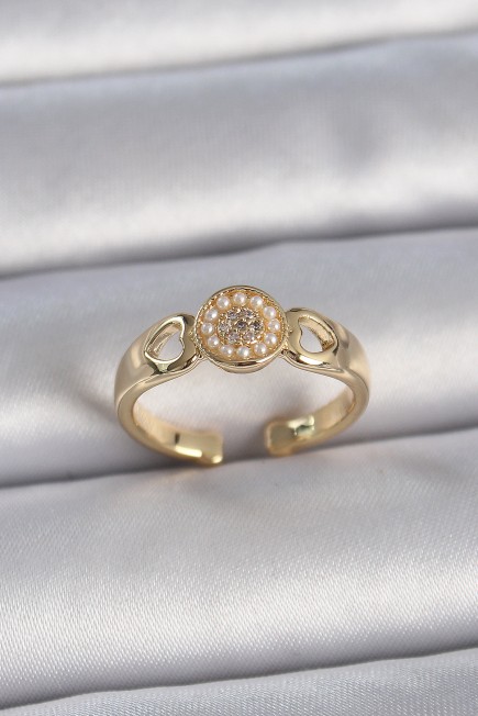 Pirinç Gold Renk Zirkon Taşlı İncili Kalp İşleme Detay Ayarlanabilir Kadın Yüzük - 258695