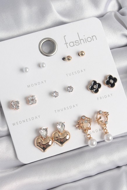 Pirinç Gold Renk Zirkon Taşlı Kalp Figür Siyah Yonca Detay 7 Çift Kadın Küpe Seti - 262494