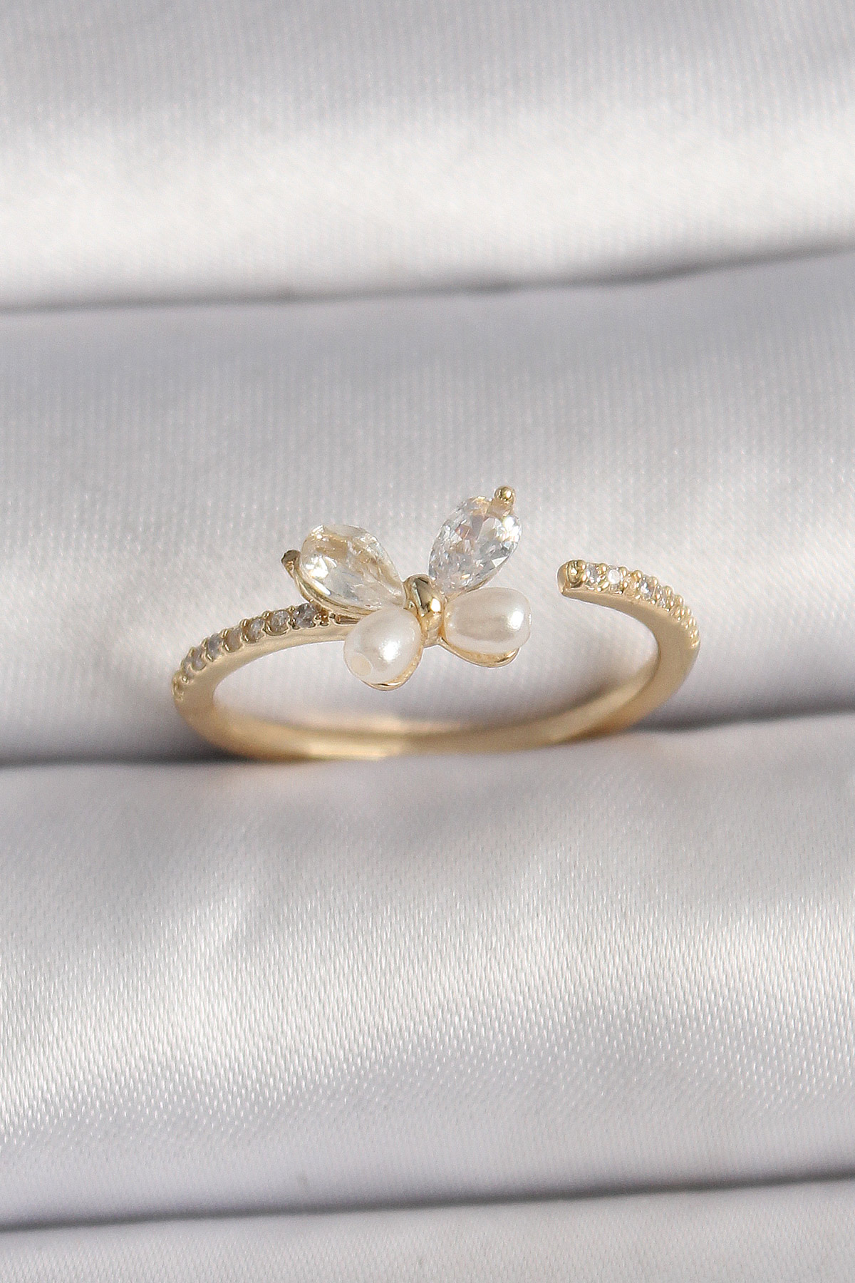 Pirinç Gold Renk Zirkon Taşlı Kelebek Mode İnci Detay Ayarlanabilir Yüzük - 259974