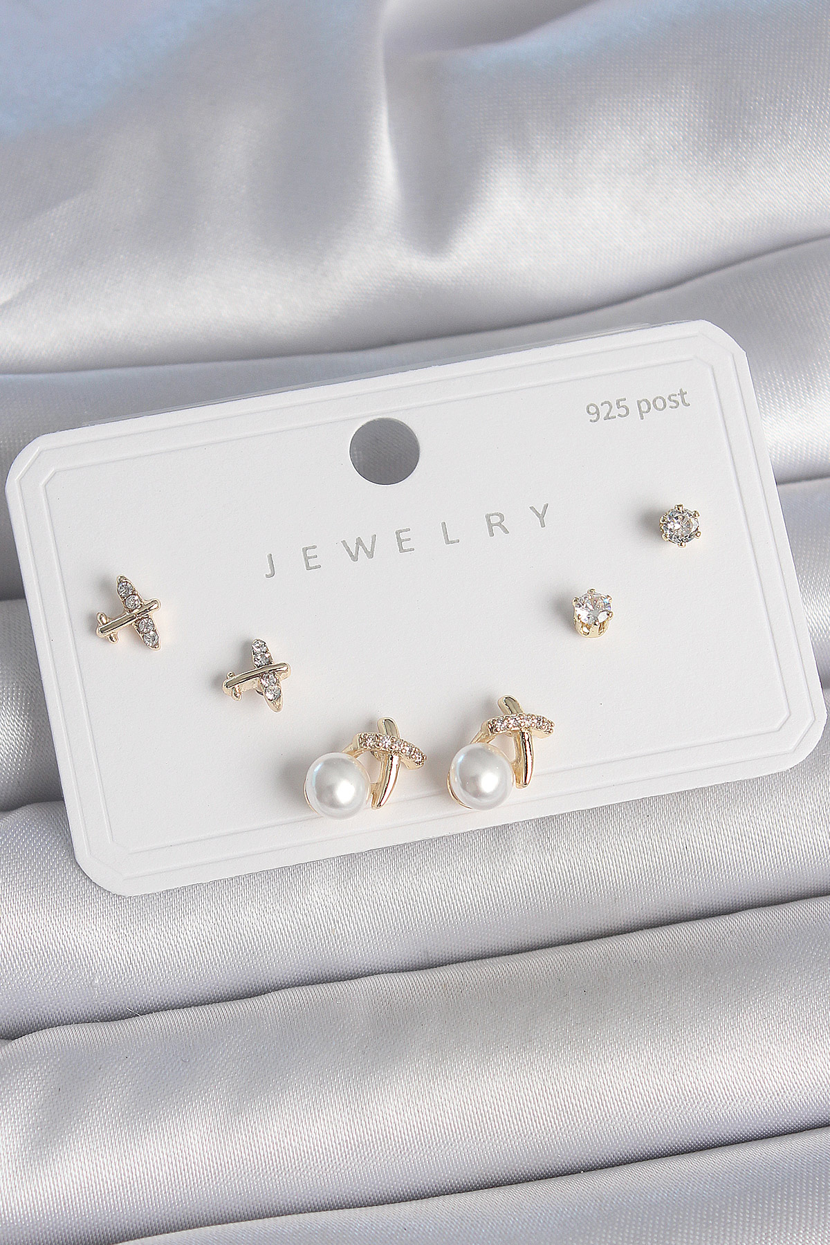 Pirinç Gold Renk Zirkon Taşlı Kelebek Model İnci Detay 925 Ayar Gümüş Çivi Kadın Küpe Seti - 262046