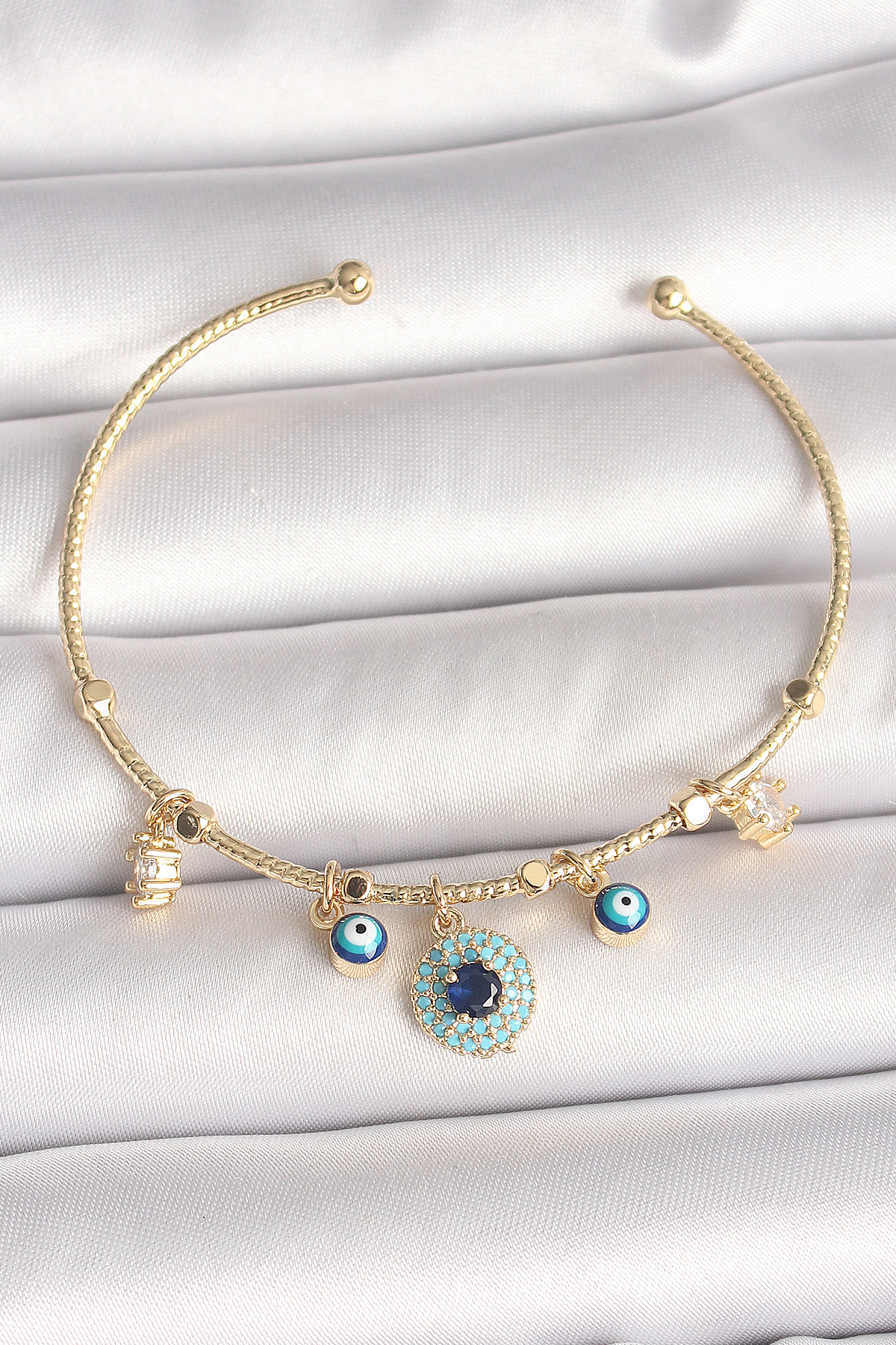 Pirinç Gold Renk Zirkon Taşlı Nazar Boncuk Detay Charm Kadın Bileklik - 261675