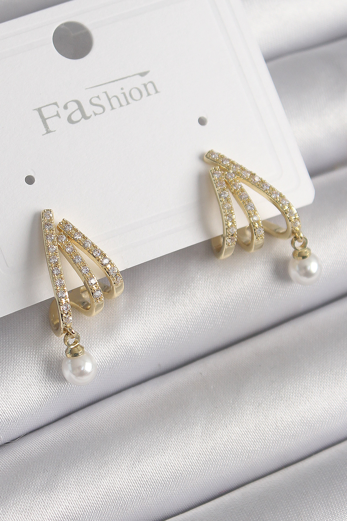 Pirinç Gold Renk Zirkon Taşlı Pençe Model İnci Detay Kadın Küpe - 259876