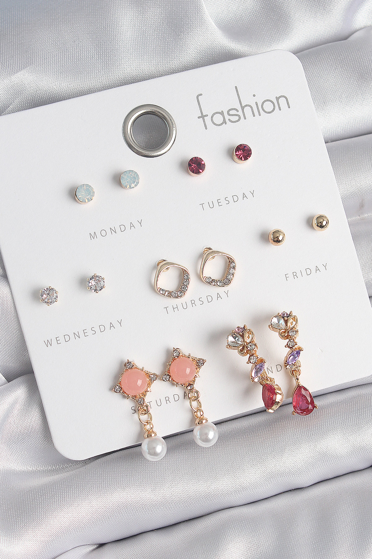 Pirinç Gold Renk Zirkon Taşlı Sallantı İnci Detay 7 Çift Kadın Küpe - 262487