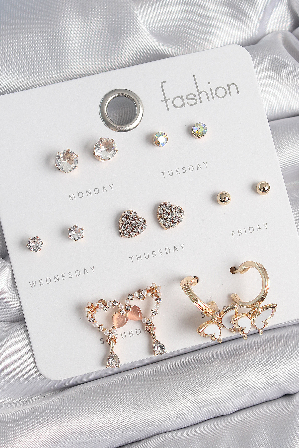 Pirinç Gold Renk Zirkon Taşlı Sallantılı Kalp Figür Kelebek Detay 7 Çift Kadın Küpe Seti - 262492