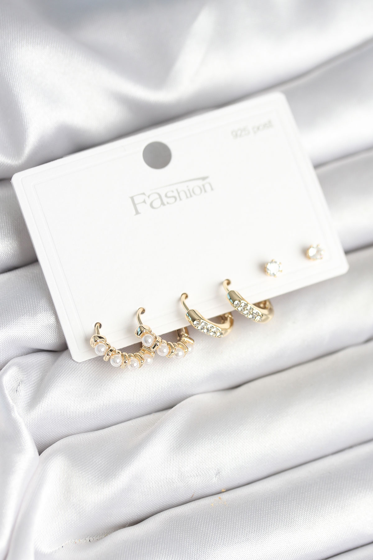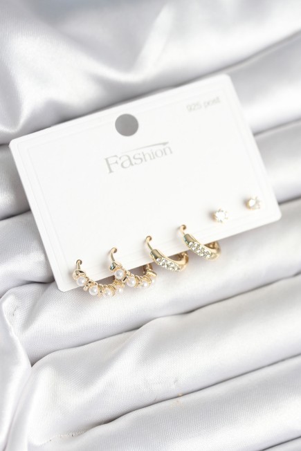 Pirinç Gold Renk Zirkon Taşlı ve İncili Model 925 Ayar Gümüş Çivi Kadın Küpe Seti - 265970