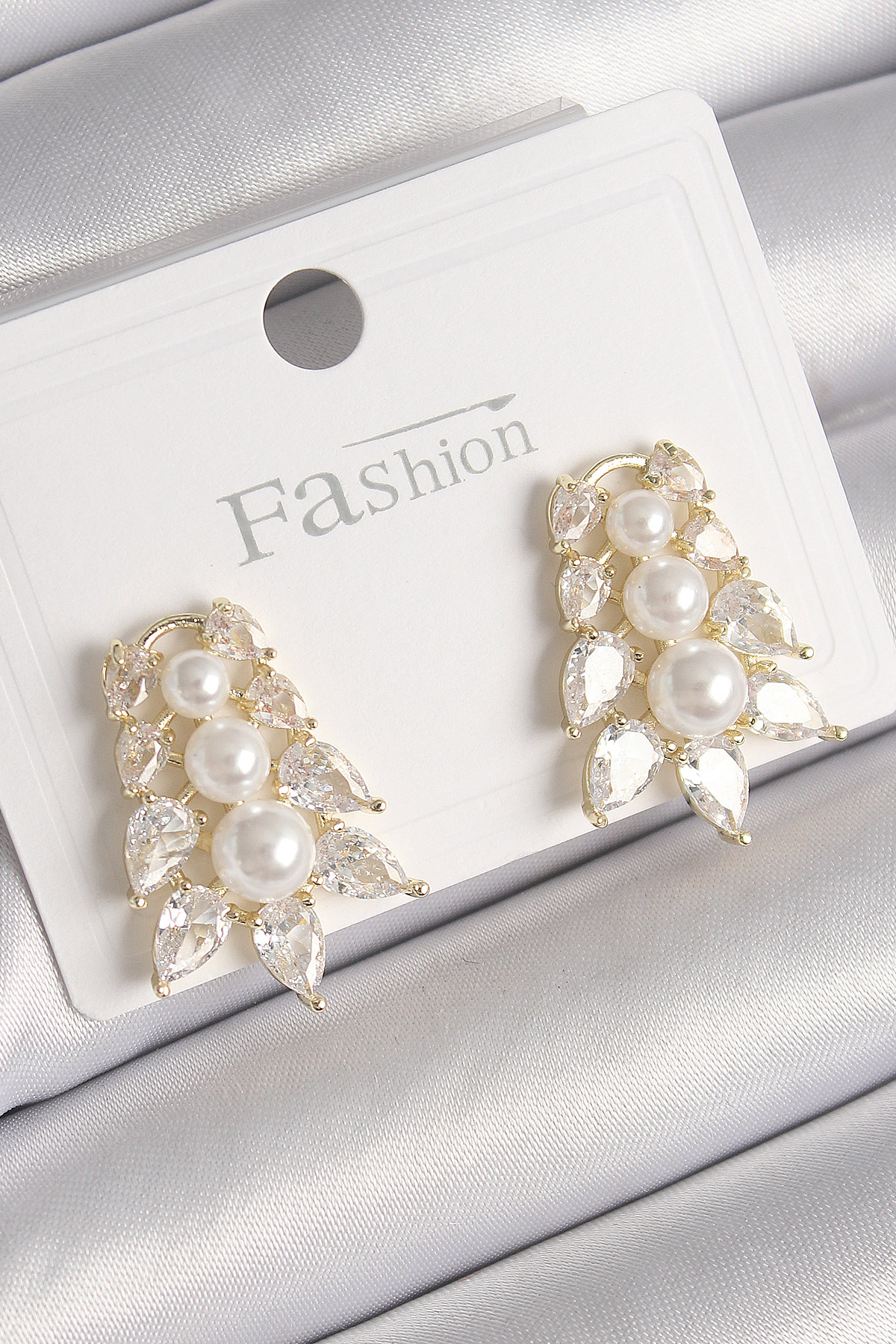 Pirinç Gold Renk Zirkon Taşlı Yaprak Model İnci Detay Kadın Küpe - 259346
