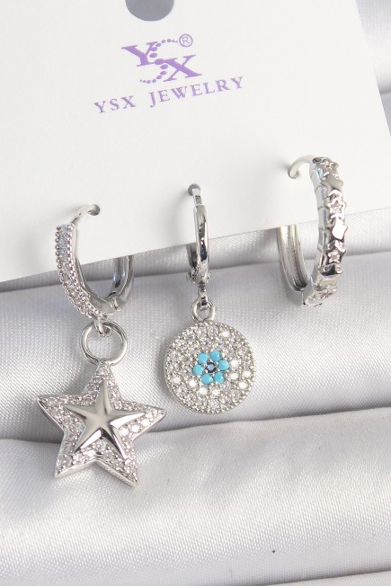 Pirinç Gold Renk Zirkon Taşlı Yıldız Model Nazar Boncuk Detay 3'Lü Kadın Kombin Küpe - 261926