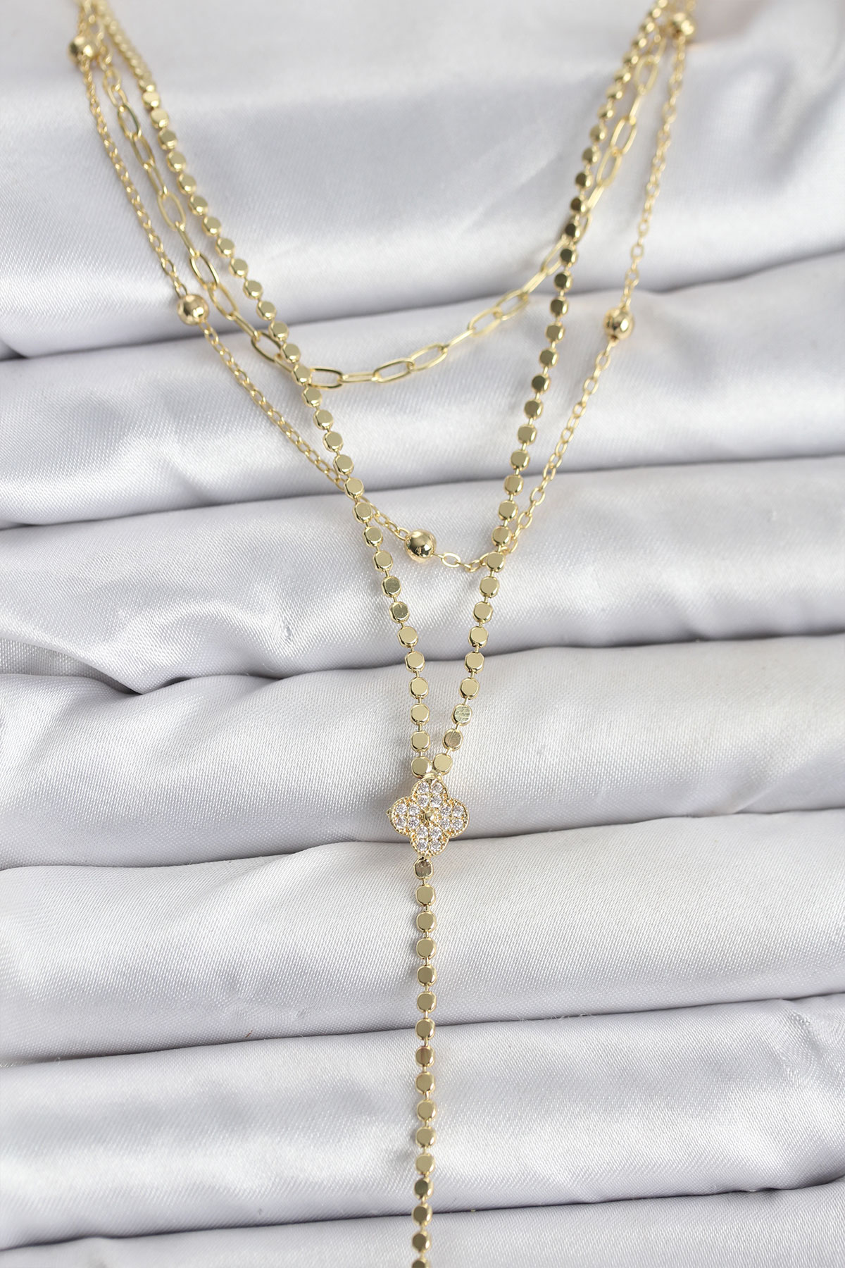 Pirinç Gold Renk Zirkon Taşlı Yonca Model Detaylı 3'lü Kombin Y Kadın Kolye - 266324
