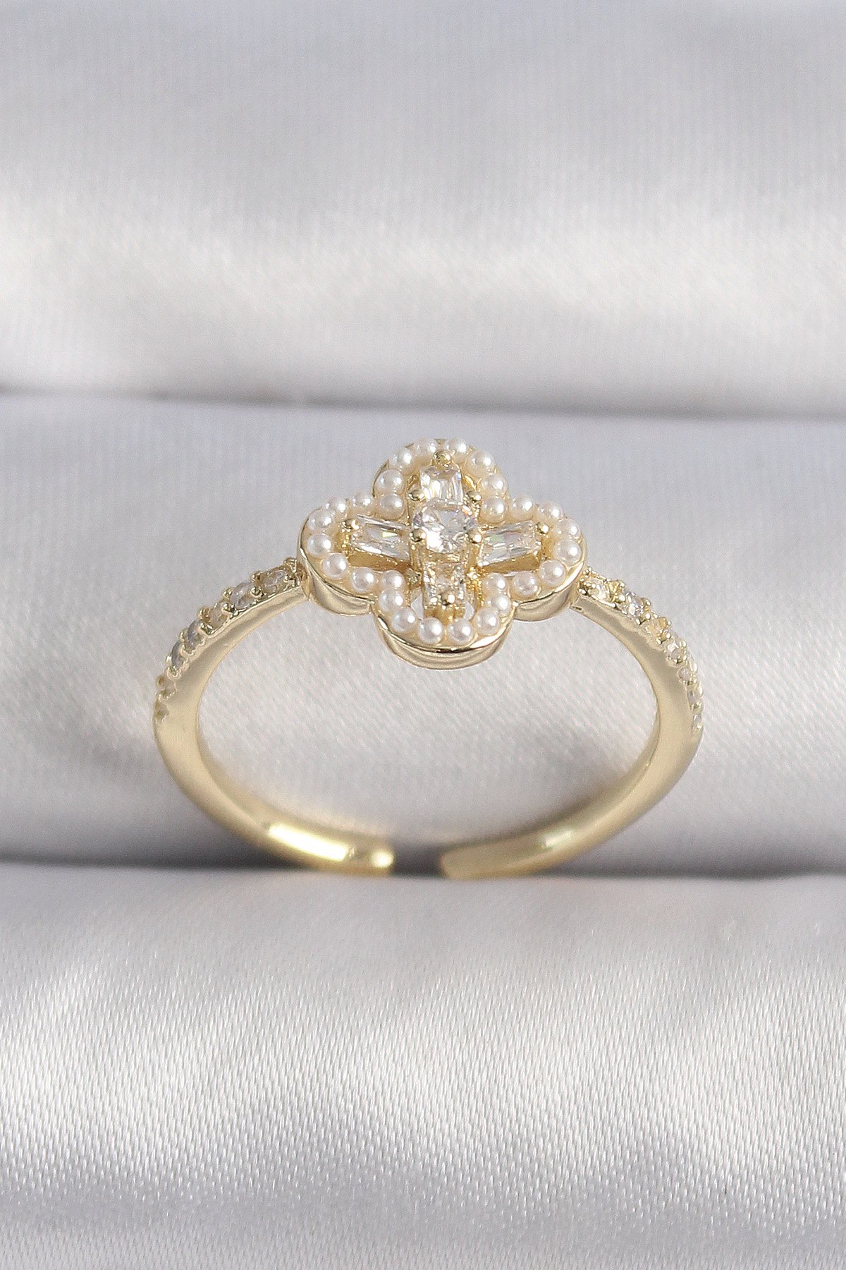 Pirinç Gold Renk Zirkon Taşlı Yonca Model İnci Detay Kadın Yüzük - 259403