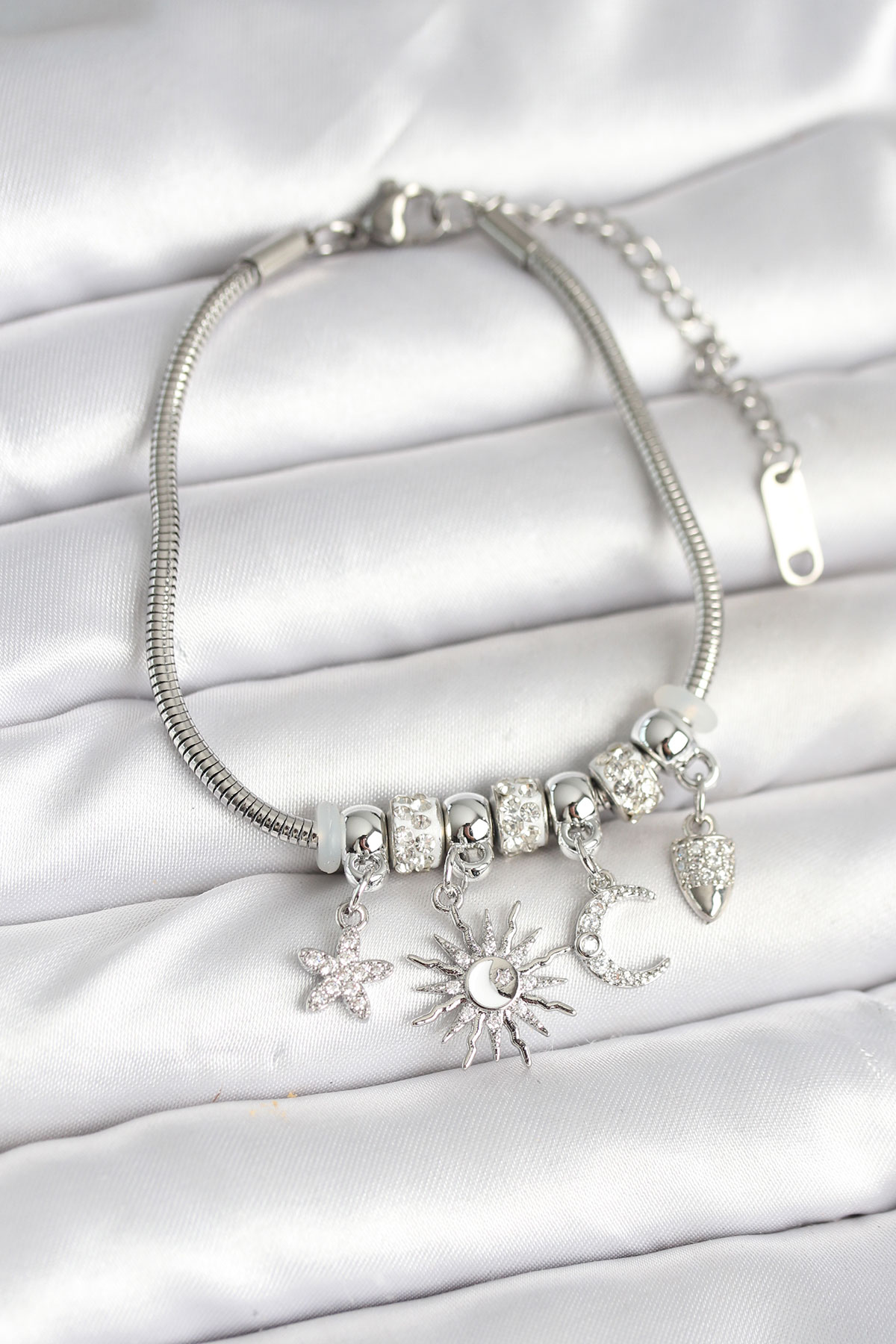 Pirinç Gümüş Renk Ay ve Güneş Charmlı Kadın Bileklik - 265912