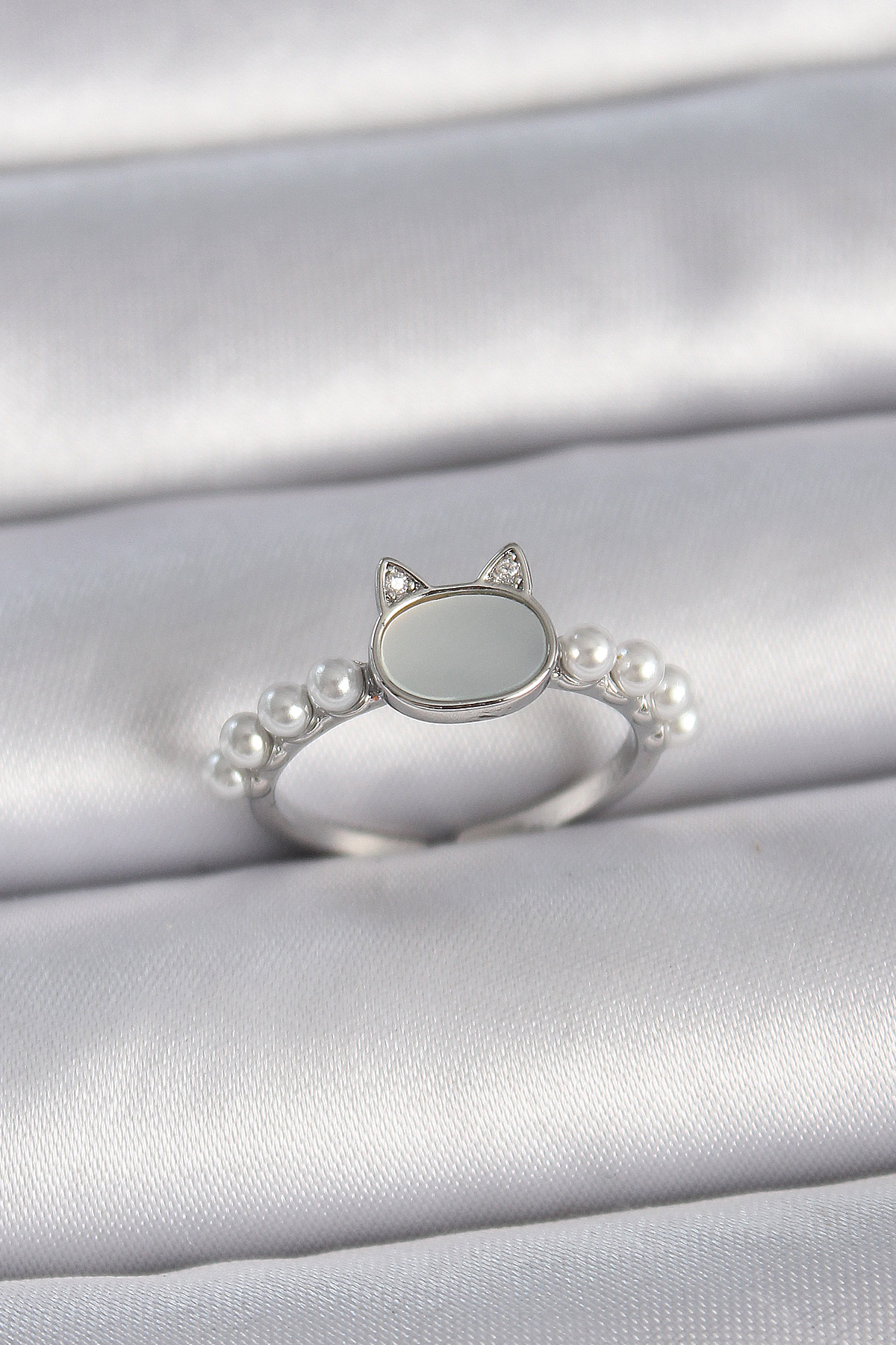 Pirinç Gümüş Renk Ayarlanabilir Beyaz Mineli Kedi Model İnci Detay Kadın Yüzük - 258724