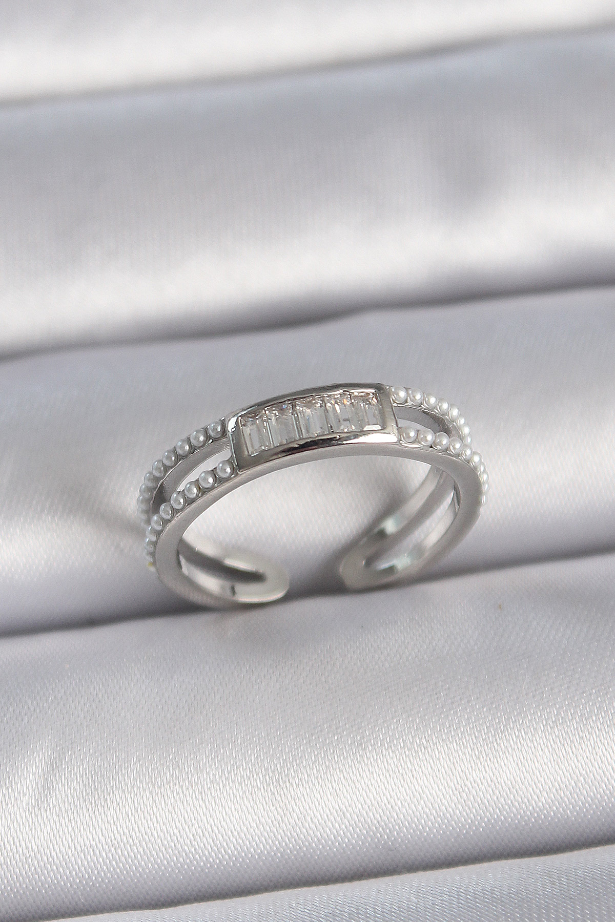 Pirinç Gümüş Renk Ayarlanabilir Sıralı İncili Zirkon Taşlı Kadın Yüzük - 258718