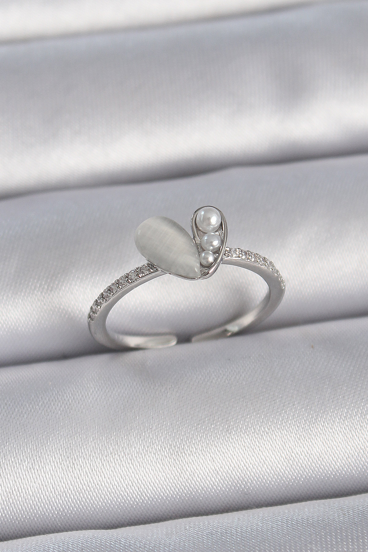 Pirinç Gümüş Renk Ayarlanabilir Zirkon Taşlı İncili Beyaz Mineli Kalp Model Kadın Yüzük - 258714