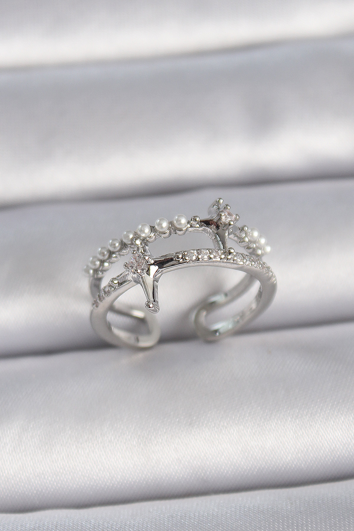 Pirinç Gümüş Renk Ayarlanabilir Zirkon Taşlı Kutup Yıldız İnci Detay Kadın Yüzük - 258730