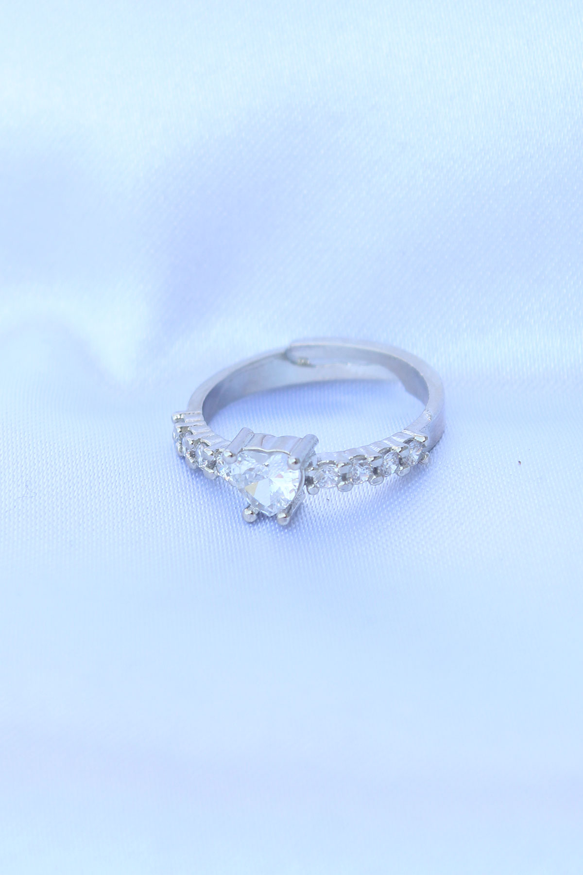 Pirinç Gümüş Renk Ayarlanabilir Zirkon Taşlı Minimal Kalp Yüzük - 255516