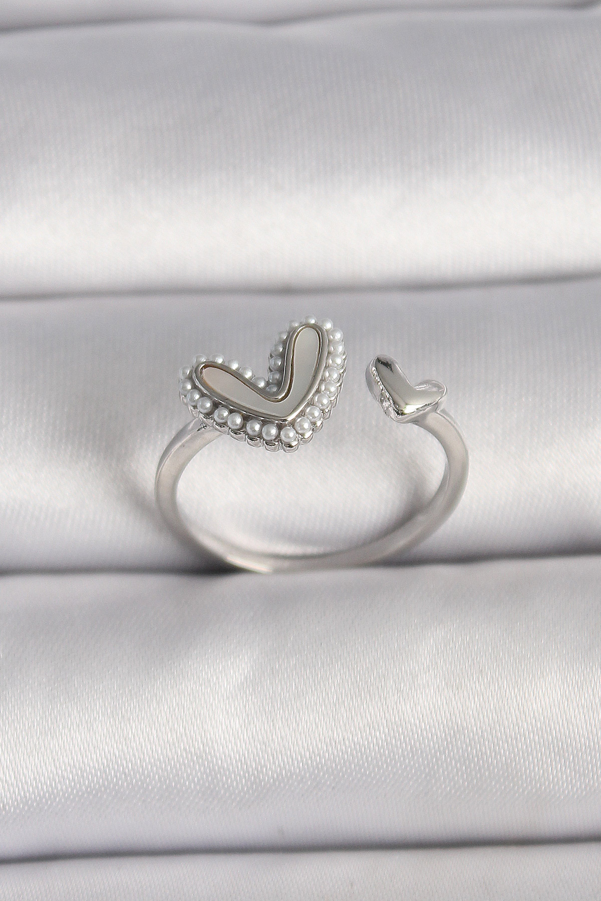 Pirinç Gümüş Renk Beyaz Mineli İnci Detaylı Kalp Model Ayarlanabilir Yüzük - 259953
