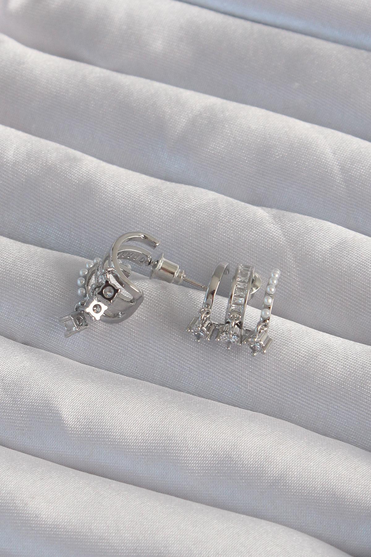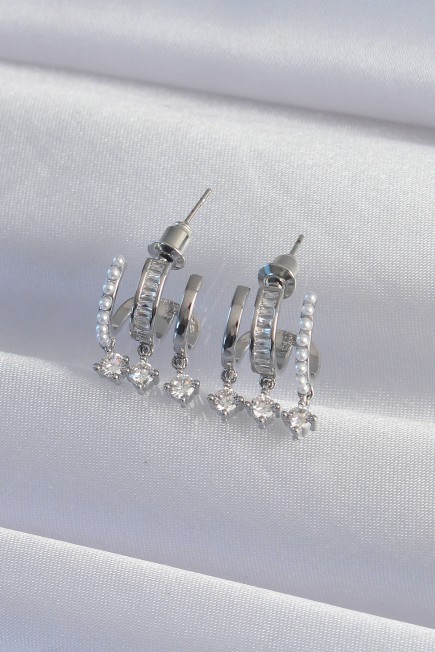 Pirinç Gümüş Renk İncili Çoklu Zirkon Taşlı Yarım Halka Küpe - 256621