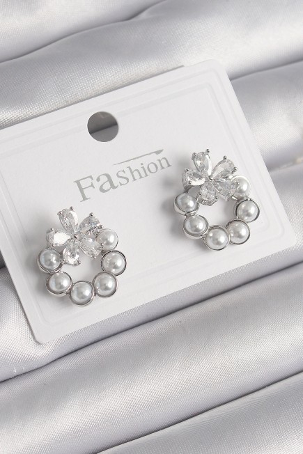 Pirinç Gümüş Renk İncili Halka Model Zirkon Taşlı Çiçek Detay Kadın Küpe - 259917