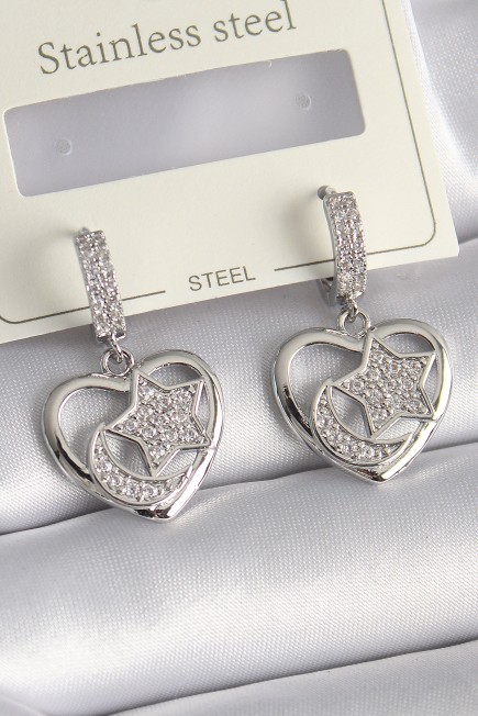 Pirinç Gümüş Renk Kalp Model Zirkon Taşlı Ay Yıldız İşlemeli Kadın Küpe - 259019