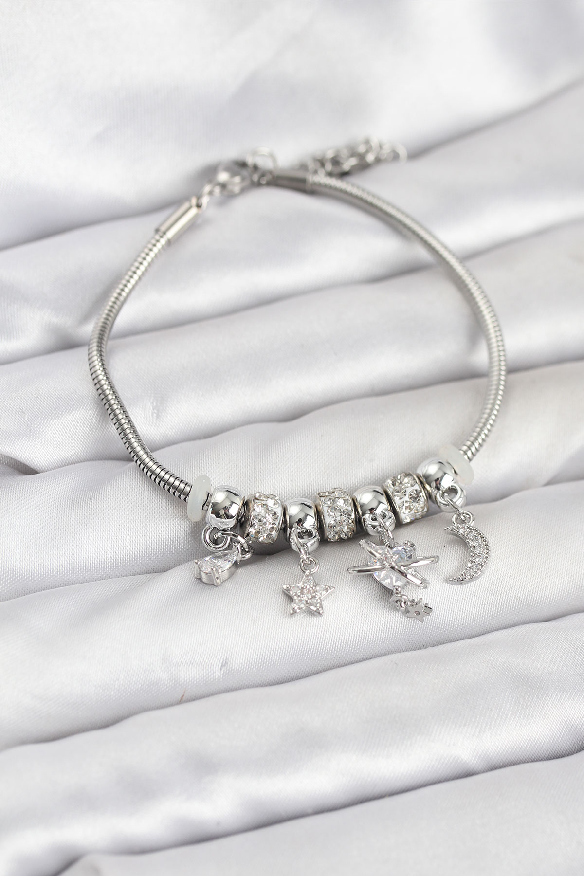 Pirinç Gümüş Renk Kalpli Model Charmlı Kadın Bileklik - 266872