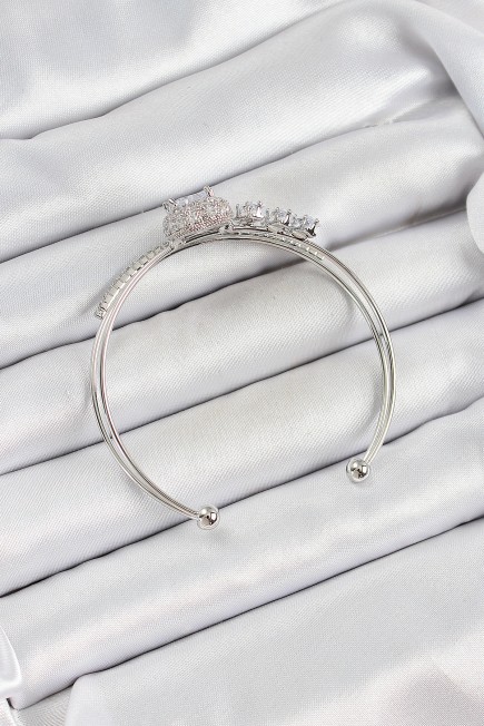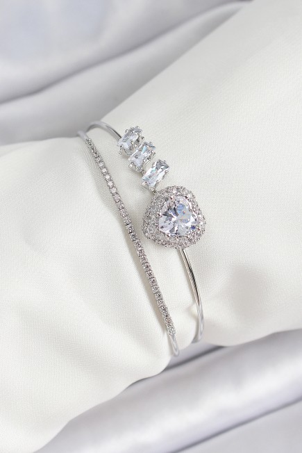 Pirinç Gümüş Renk Kalpli Zirkon Taşlı Kadın Bileklik - 263222