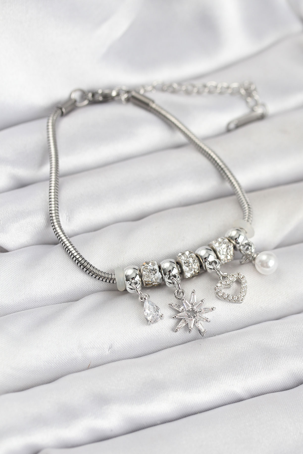 Pirinç Gümüş Renk Kutup Yıldızı ve Kalp Charmlı Kadın Bileklik - 266876