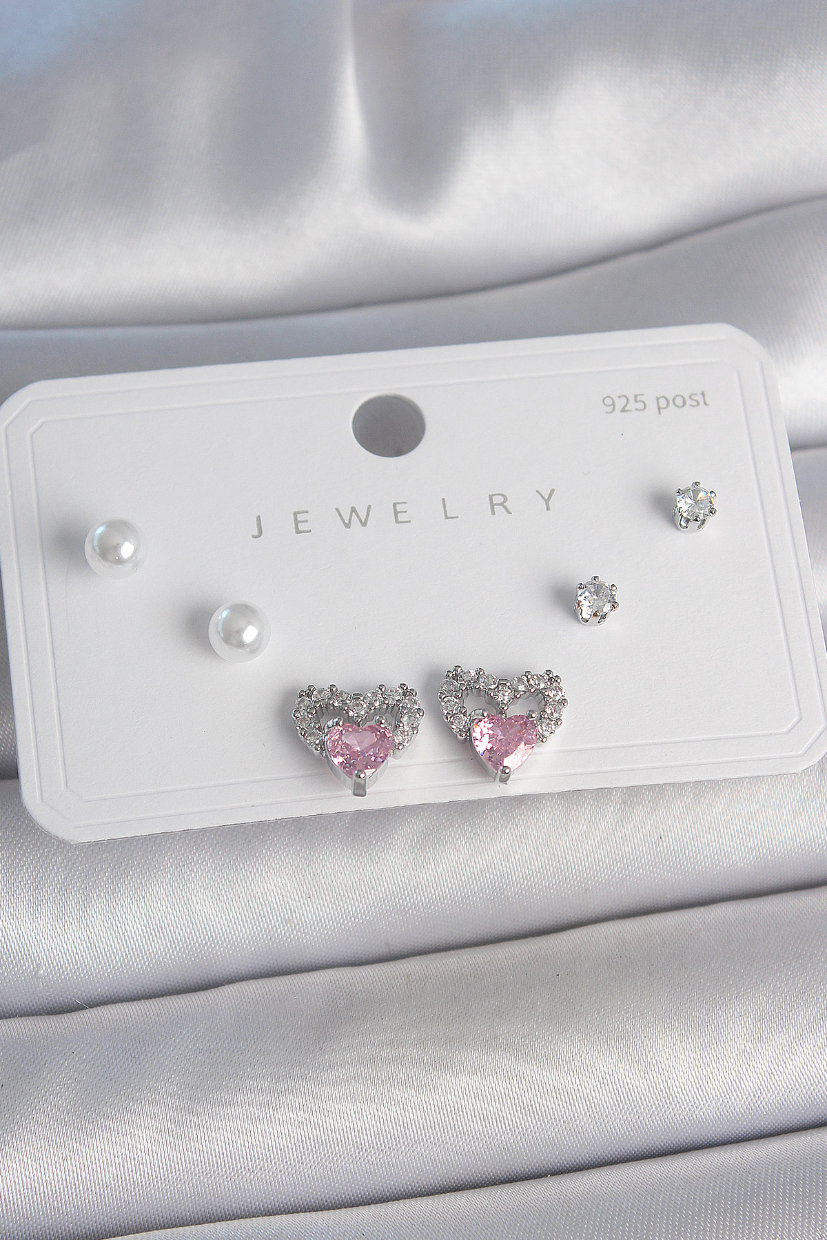 Pirinç Gümüş Renk Pembe Zirkon Taşlı Kalp Model İnci Detay 925 Ayar Gümüş Çivi Kadın Küpe Seti - 262057