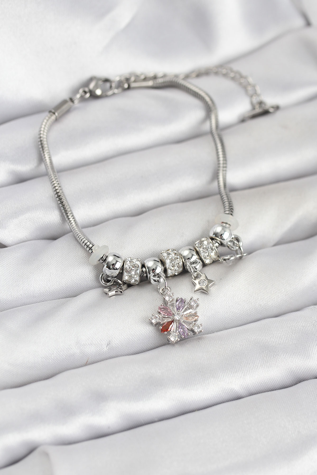 Pirinç Gümüş Renk Renkli Yıldız Charmlı Kadın Bileklik - 266882