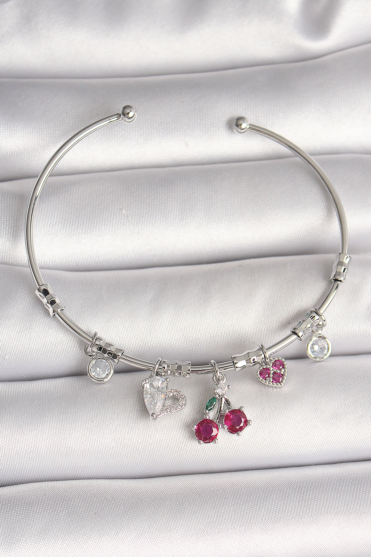 Pirinç Gümüş Renk Sallantı Kiraz Figür Kalp Detay Charm Kadın Bileklik - 261693