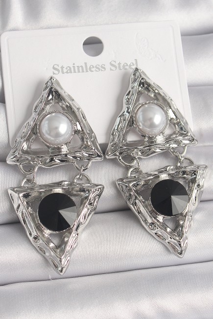 Pirinç Gümüş Renk Sallantı Üçgen Model İnci Detay Kadın Küpe - 260403