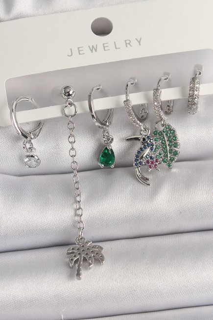 Pirinç Gümüş Renk Sallantı Zirkon Taşlı Ağaç Figür Çoklu Kadın Küpe Seti - 260432