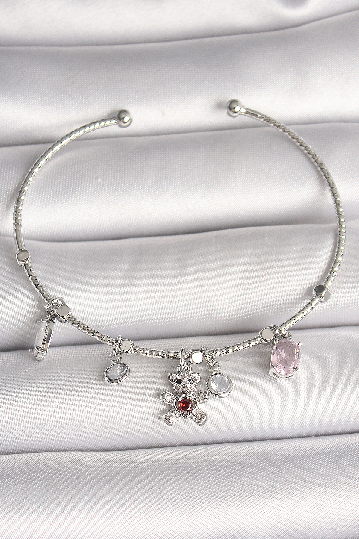 Pirinç Gümüş Renk Sallantı Zirkon Taşlı Ayıcık Figür Kırmızı Taş Detay Charm Kadın Bileklik - 261704