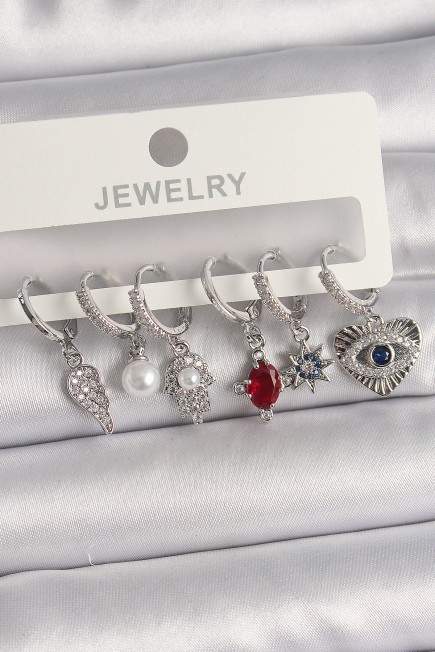 Pirinç Gümüş Renk Sallantı Zirkon Taşlı Fatma Ana El Figür Kadın Küpe Seti - 260430