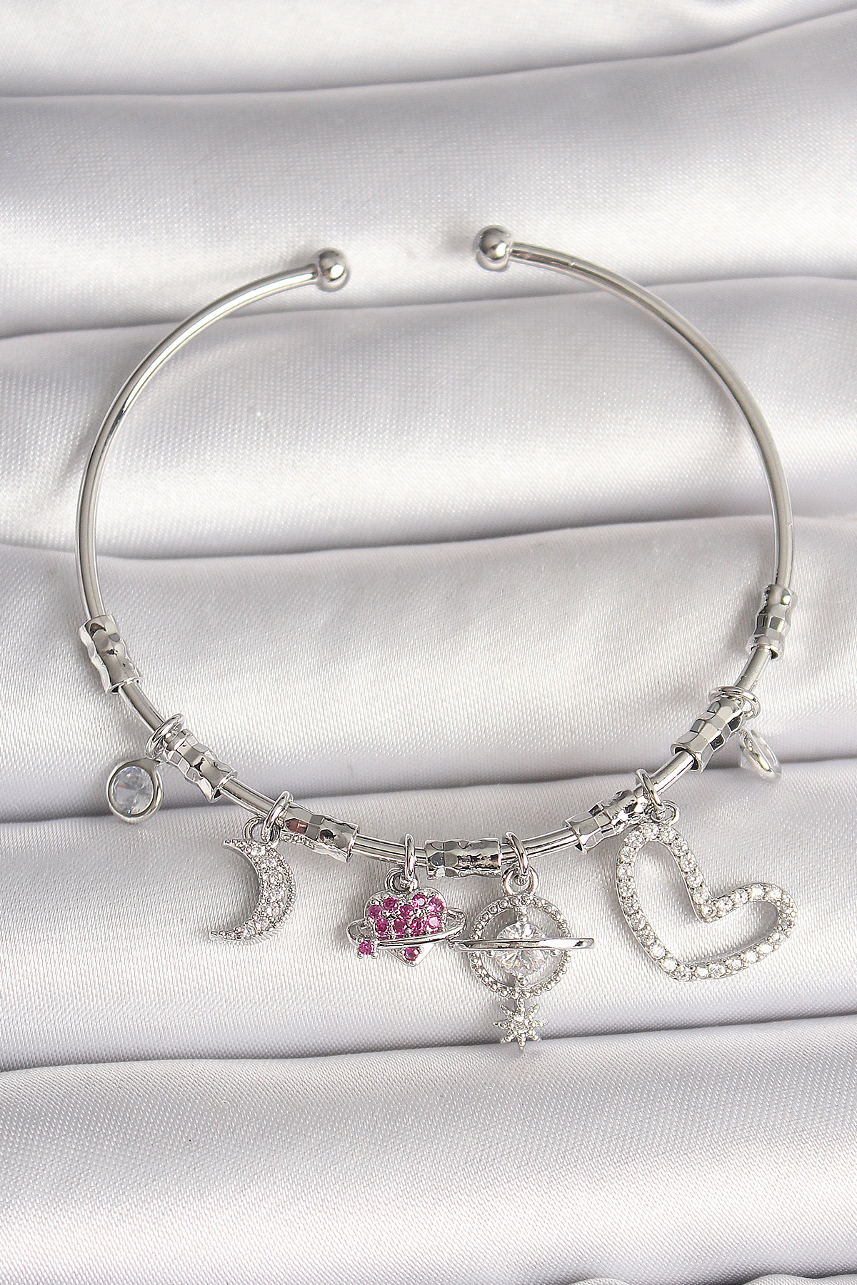 Pirinç Gümüş Renk Sallantı Zirkon Taşlı Gezegen Figür Kalp Detay Charm Kadın Bileklik - 261691