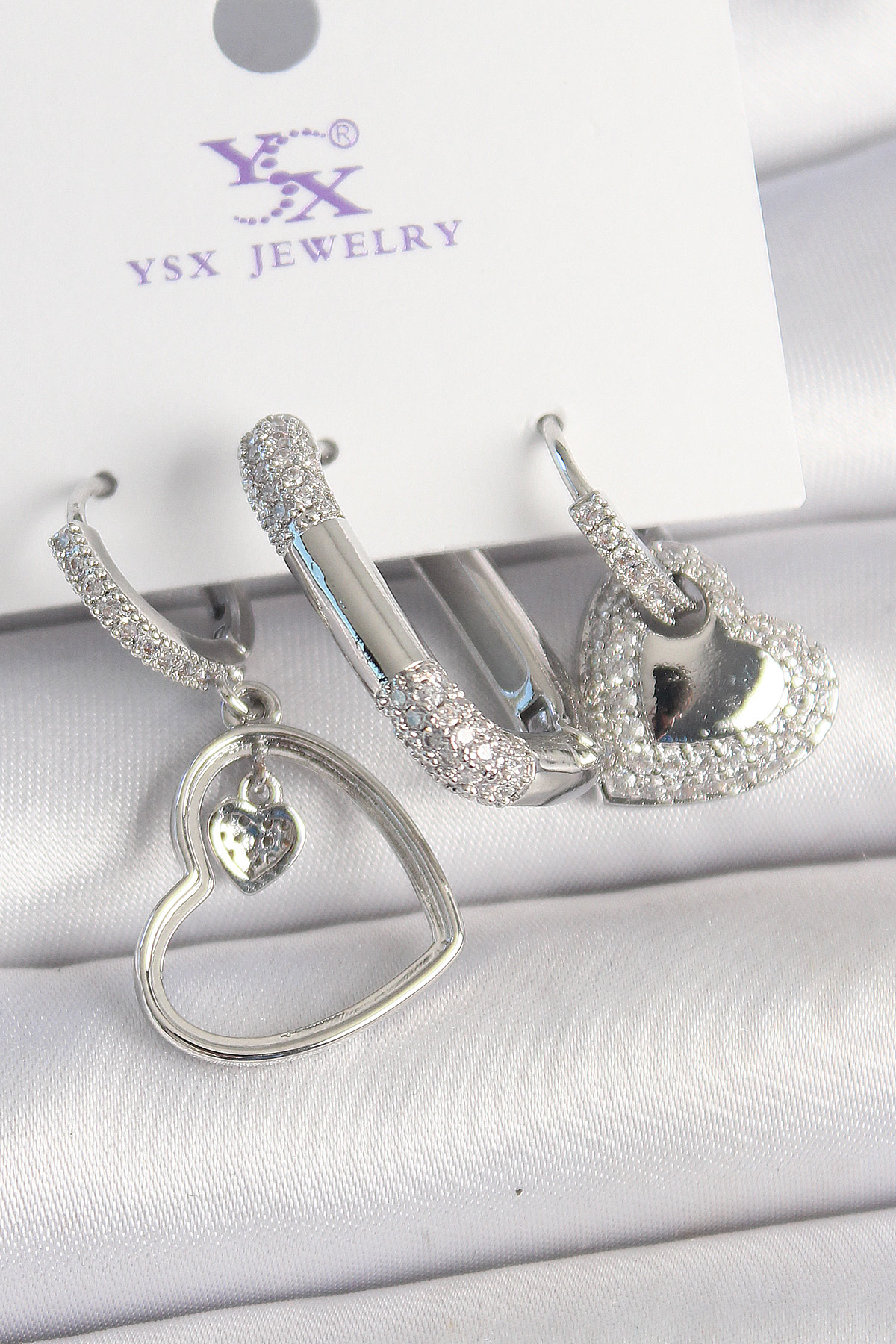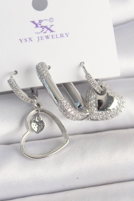 Pirinç Gümüş Renk Sallantı Zirkon Taşlı Kalp Model 3'Lü Kadın Kombin Küpe - 261922