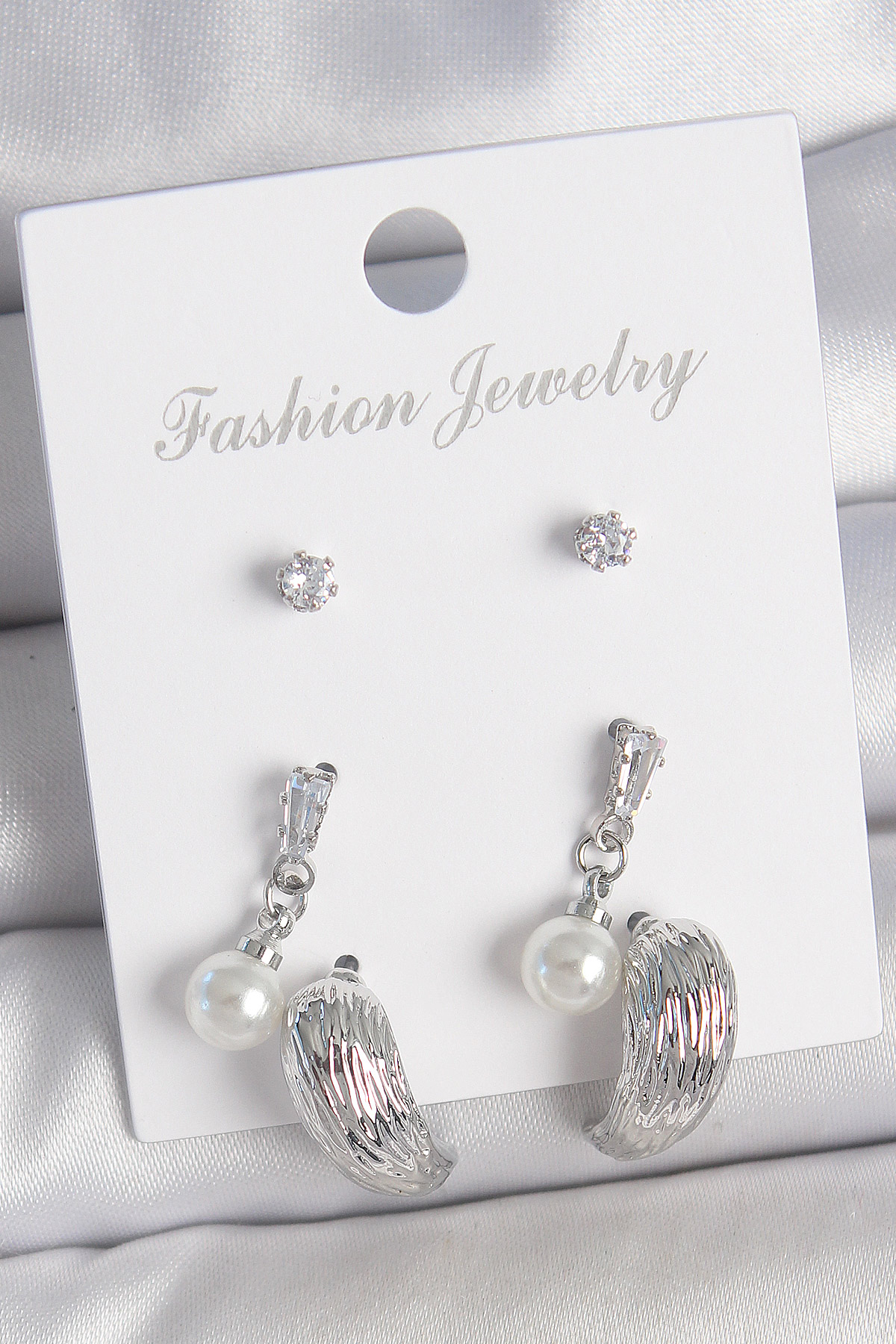 Pirinç Gümüş Renk Sallantılı Zirkon Taşlı Damla Model 3 Çift Kadın Küpe Seti - 262612