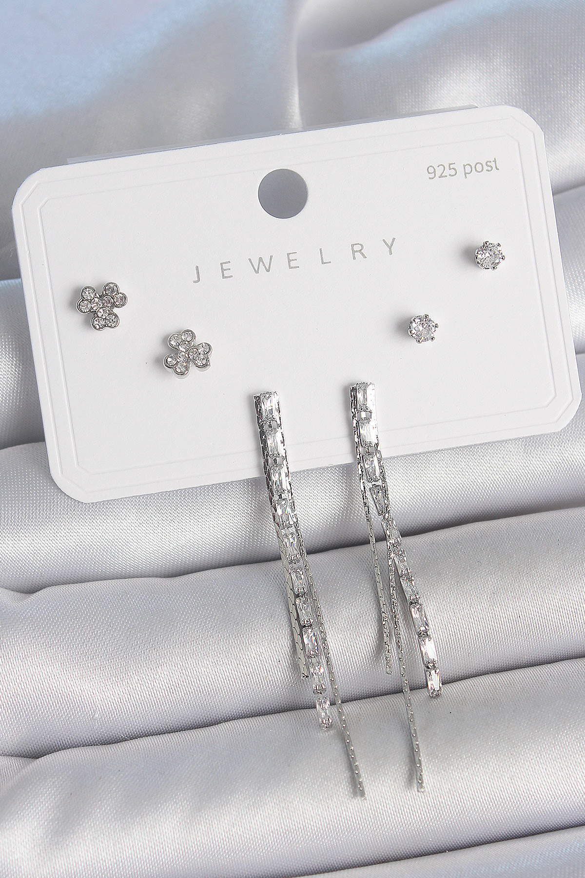 Pirinç Gümüş Renk Su Yolu Zirkon Taşlı Sallantı Model Çiçek Detay 925 Ayar Gümüş Çivi Kadın Küpe Seti - 262059