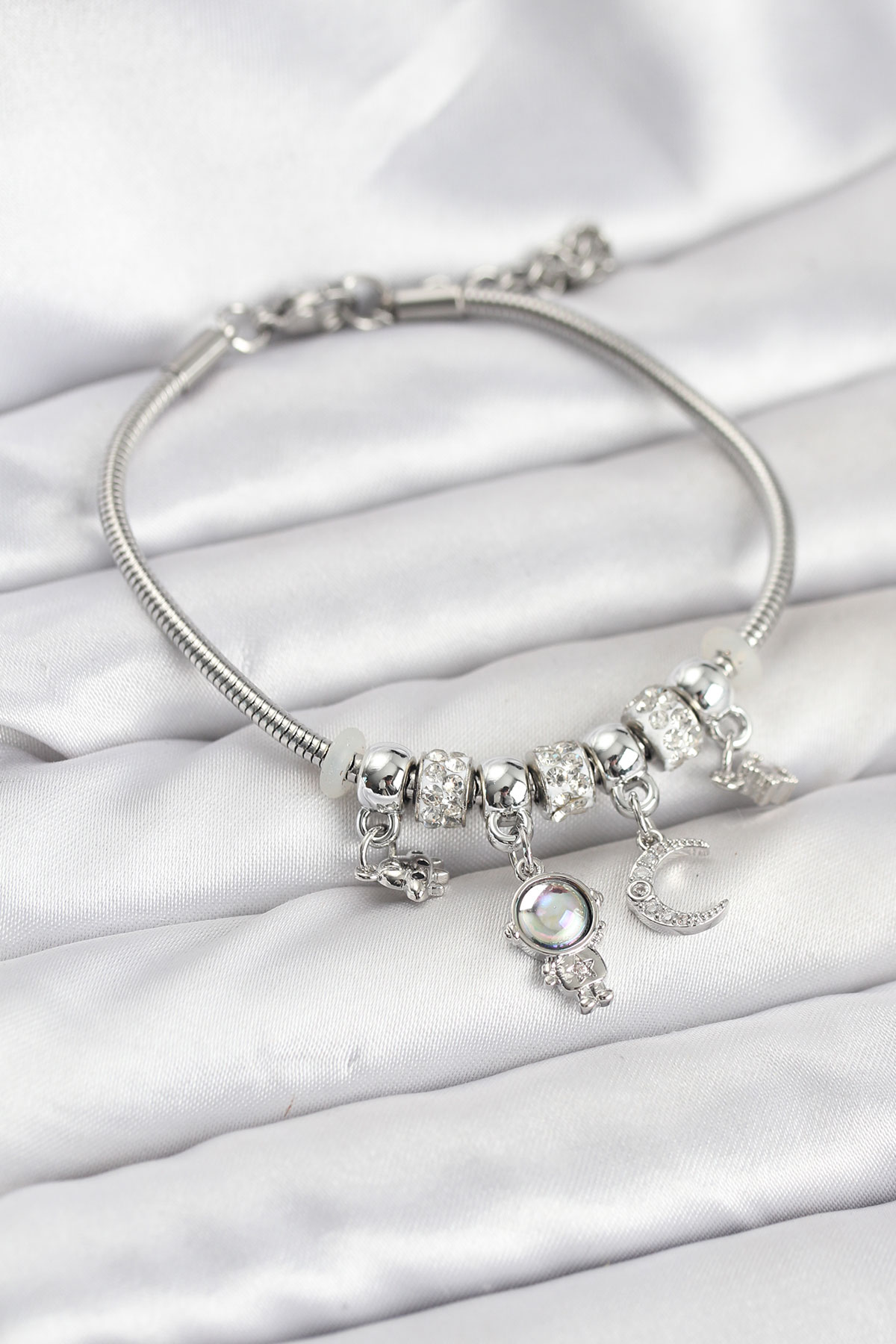 Pirinç Gümüş Renk Uzay Tema Charmlı Kadın Bileklik - 266874
