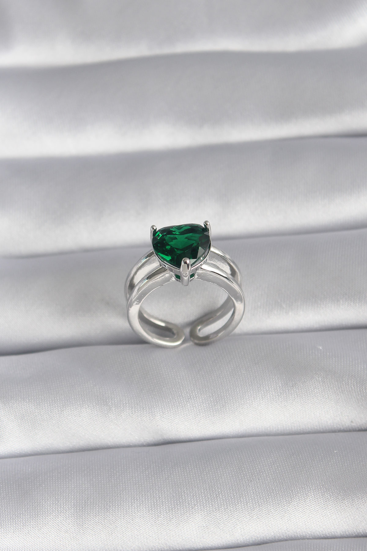 Pirinç Gümüş Renk Yeşil Zirkon Taşlı Tek Taş Model Kadın Yüzük - 253251