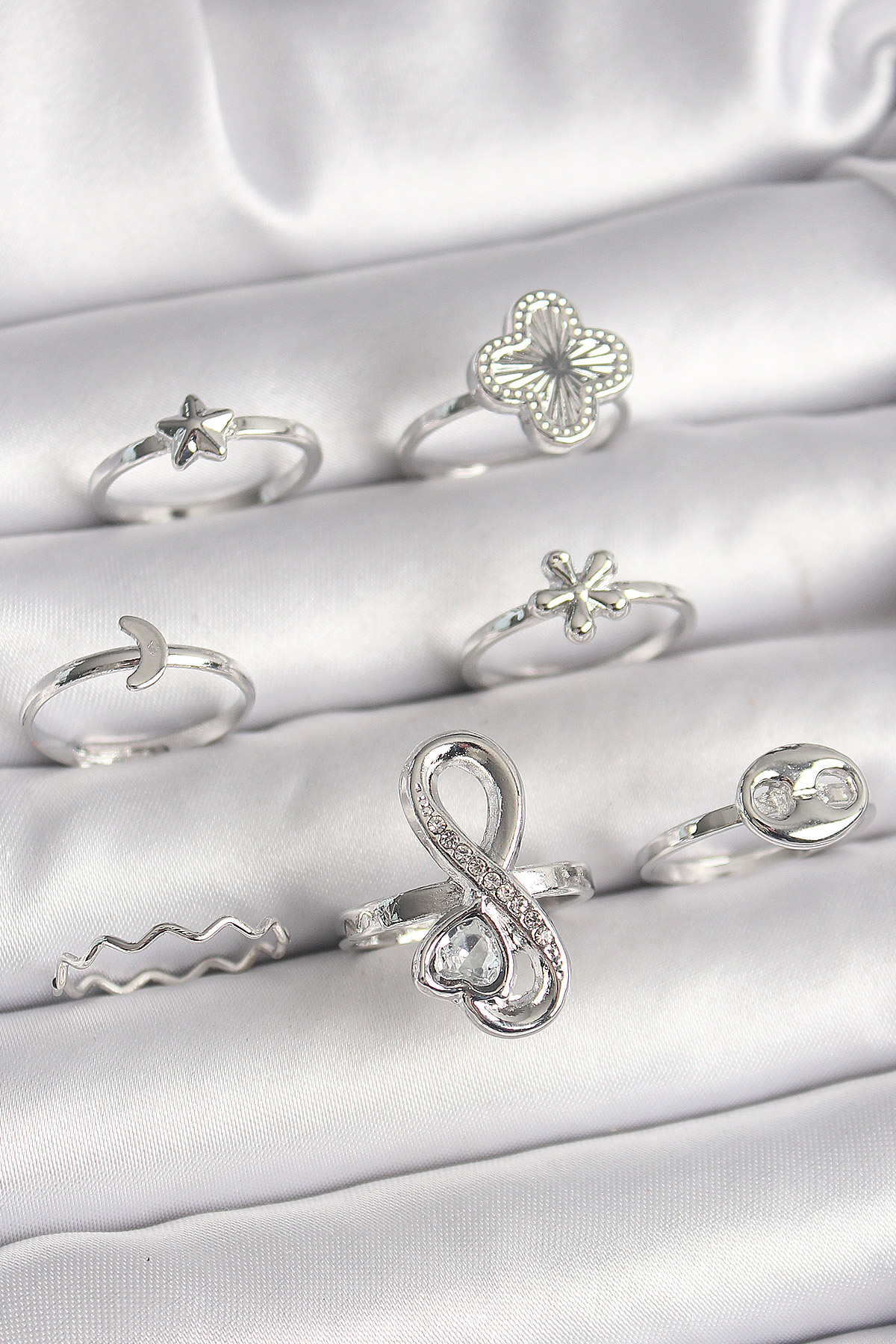 Pirinç Gümüş Renk Yonca Figür Sonsuzluk Zirkon Taşlı Kalp Detay Kadın Yüzük Kombini - 261289