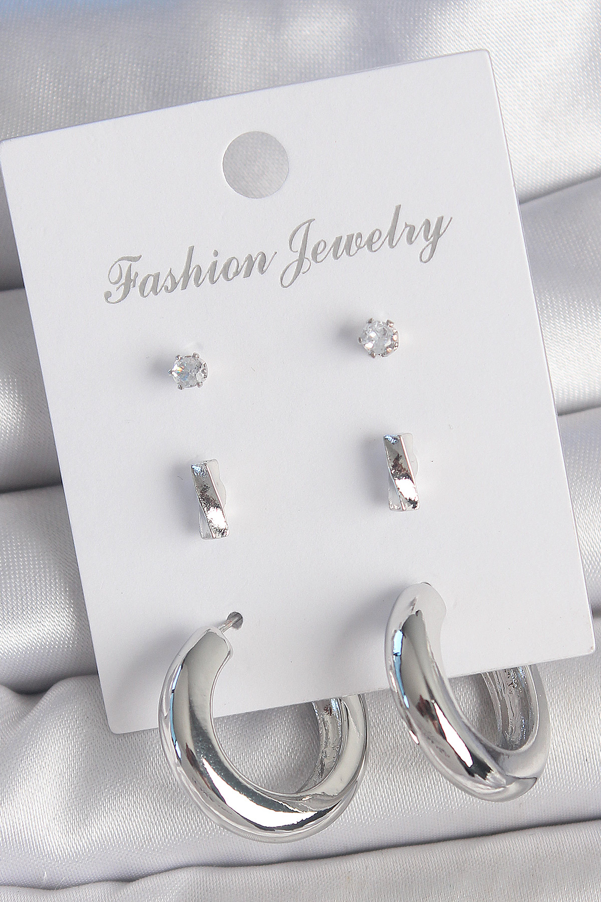 Pirinç Gümüş Renk Zirkon Taş Detay Halka Model 3 Çift Kadın Küpe Seti - 262617