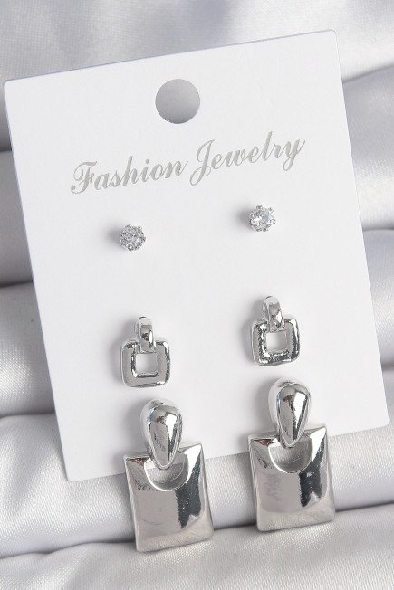 Pirinç Gümüş Renk Zirkon Taş Detay Sallantılı Kare Model 3 Çift Kadın Küpe Seti - 262622
