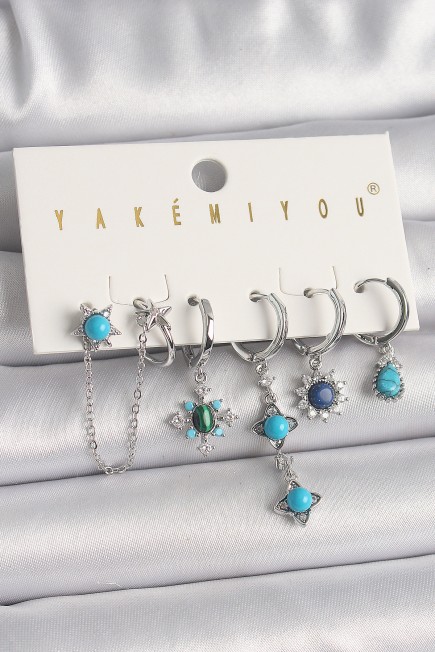 Pirinç Gümüş Renk Zirkon Taş Detaylı Mavi Boncuklu Çiçek Model VIP Seri Kadın Küpe Kombini - 260369