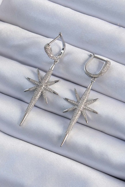 Pirinç Gümüş Renk Zirkon Taş Kaplama Kutup Yıldızı Tasarımlı Kadın Küpe - 257372