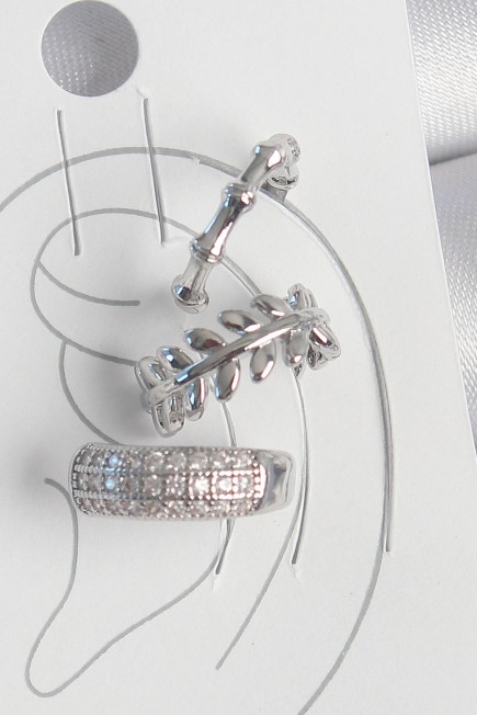 Pirinç Gümüş Renk Zirkon Taşlı 3'Lü Model Yaprak Figür Kadın Kıkırdak Küpe - 262583