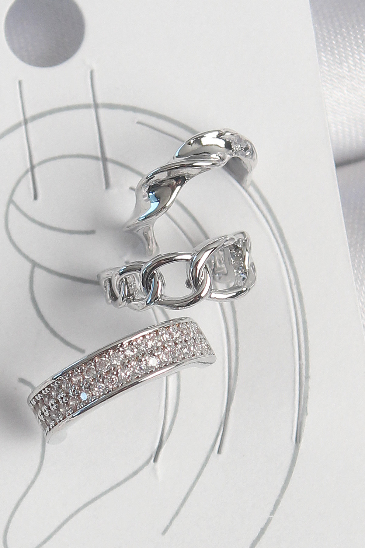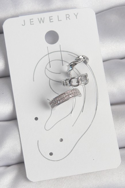 Pirinç Gümüş Renk Zirkon Taşlı 3'Lü Zincir Sarmal Model Kadın Kıkırdak Küpe - 262584