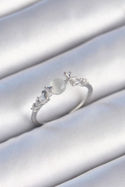 Pirinç Gümüş Renk Zirkon Taşlı Beyaz Mineli Kelebek Detay Kadın Yüzük - 259186