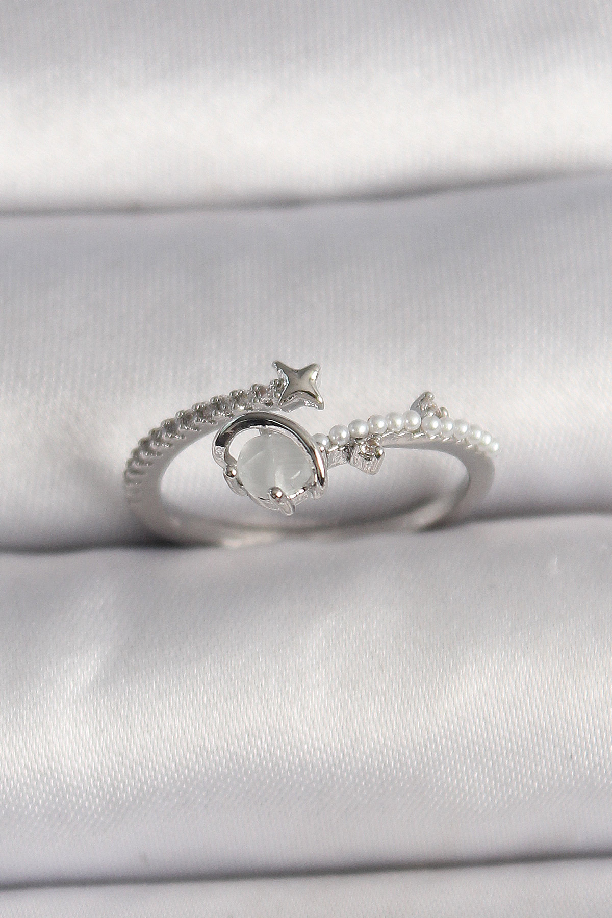 Pirinç Gümüş Renk Zirkon Taşlı Beyaz Mineli Yıldız Detay Ayarlanabilir Kadın Yüzük - 259987